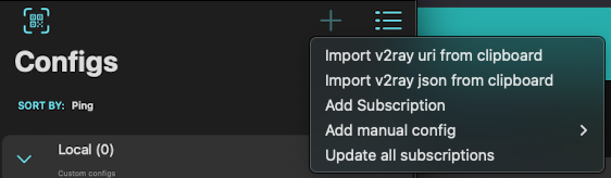 Нажмите кнопку плюс и в появившемся модальном окне выберите пункт: Import v2ray uri from clipboard
