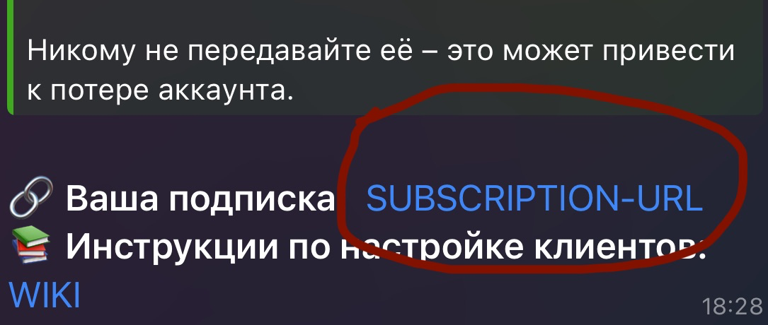 Скопируйте ваш SUBCRIPTION-URL из бота. Для этого зажмите надпись "SUBCRIPTION-URL". А далее кликните по пункту: Копировать ссылку (Или аналогичную вашему устройству)